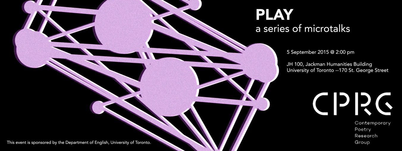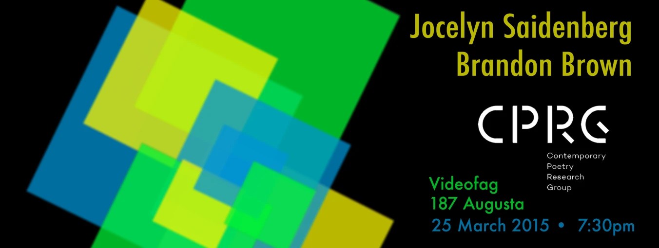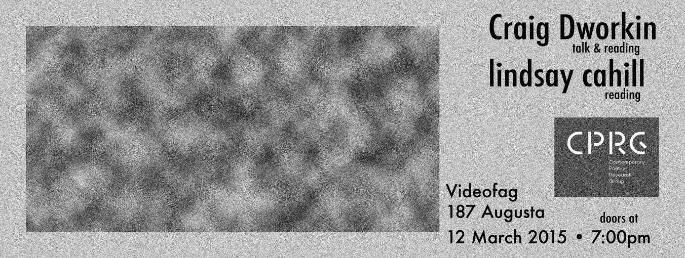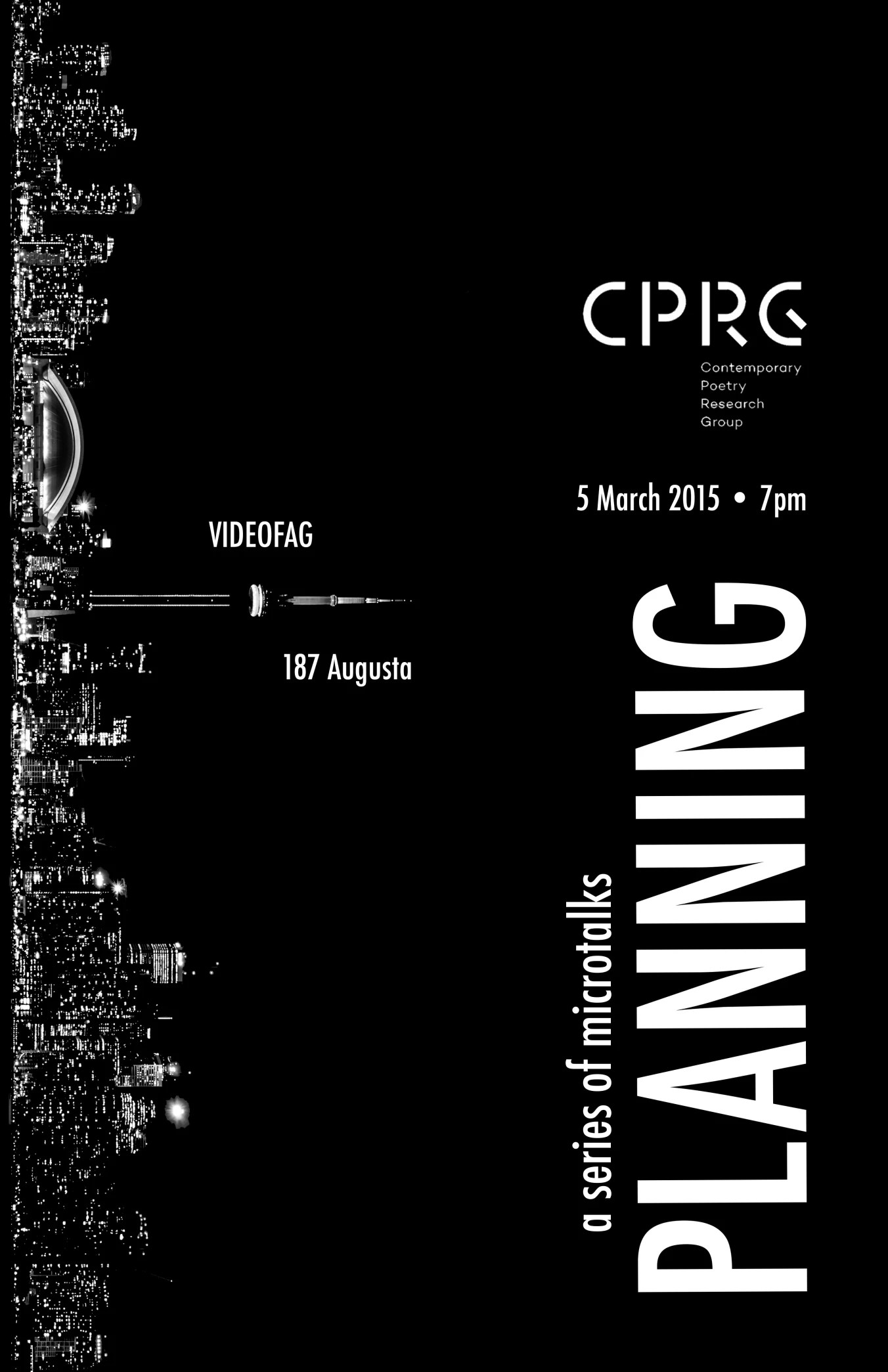The Contemporary Poetry Research Group (CPRG) organized and facilitated a short run of events in Toronto. The CPRG grew out of a reading group involving poets such as Mat Laporte, Sarah Pinder, and others. The Research Group focused on events, including talks and readings, primarily but not exclusively organized by Laporte and Schmaltz.
