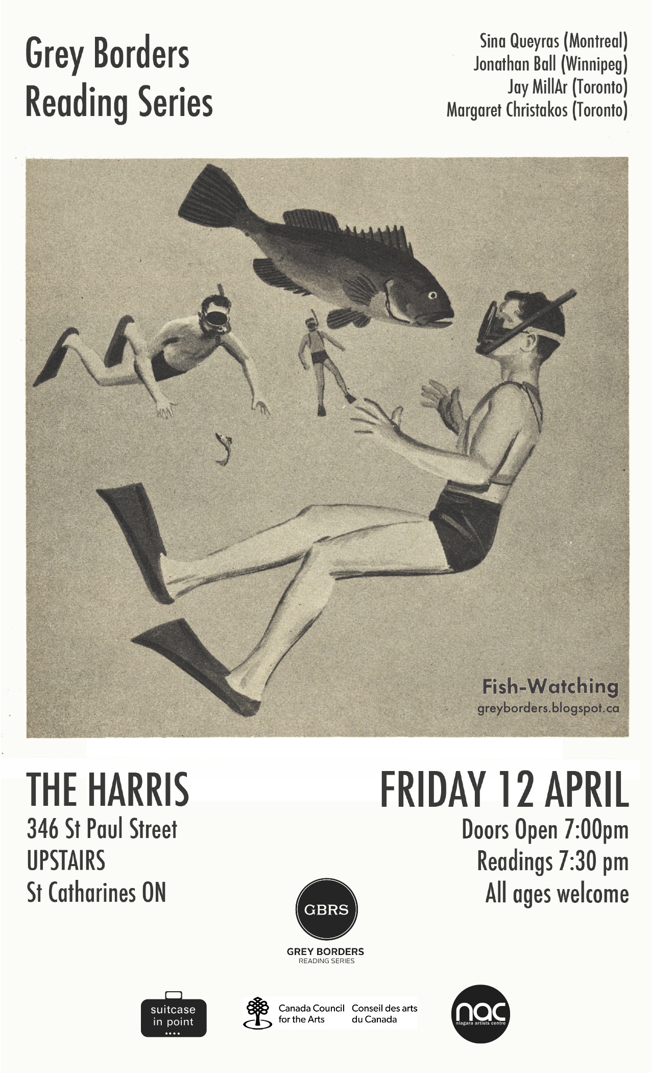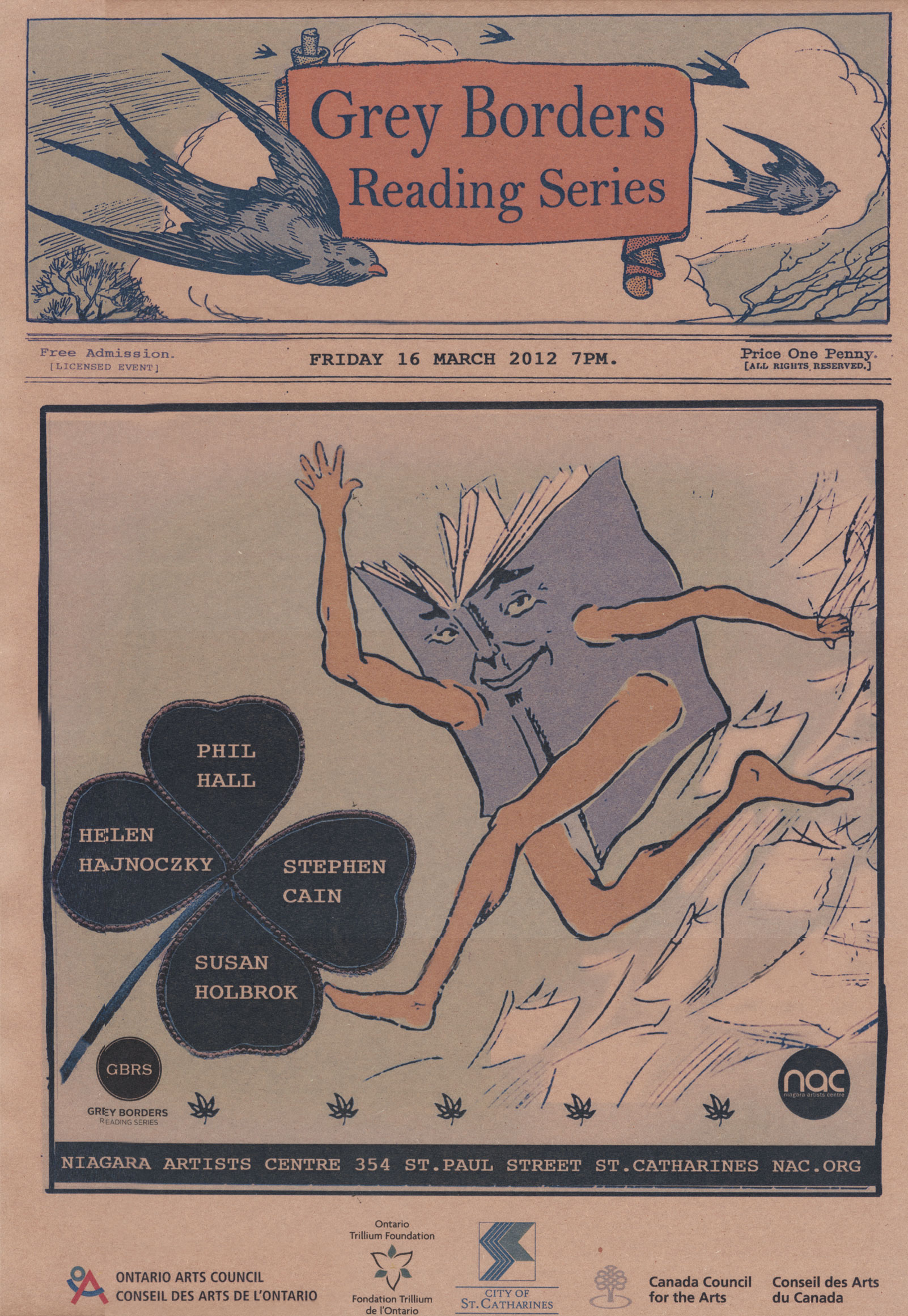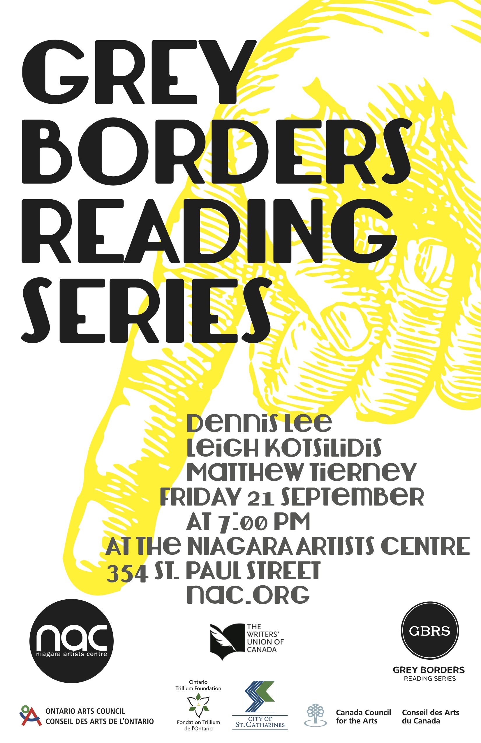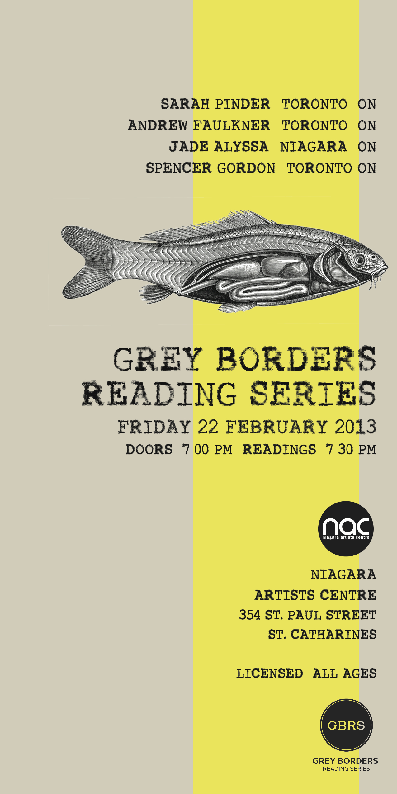 Below are promotional posters for the Grey Border Borders Readings Series, under the direction of Eric Schmaltz. Poster designers for the series included Natasha Pedros, Steve Remus, and Demi Peppas.