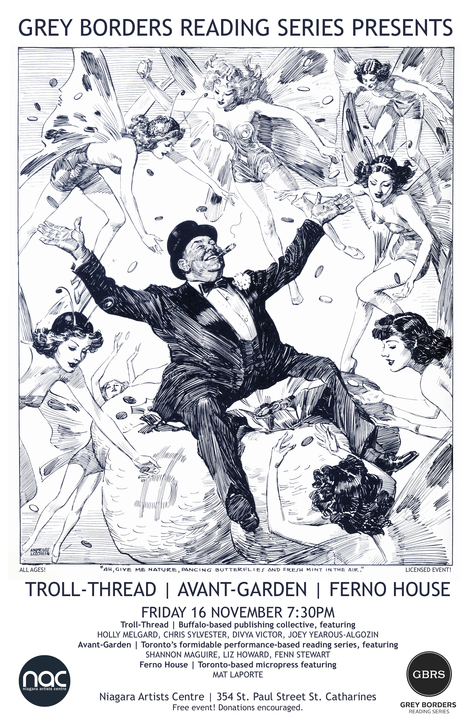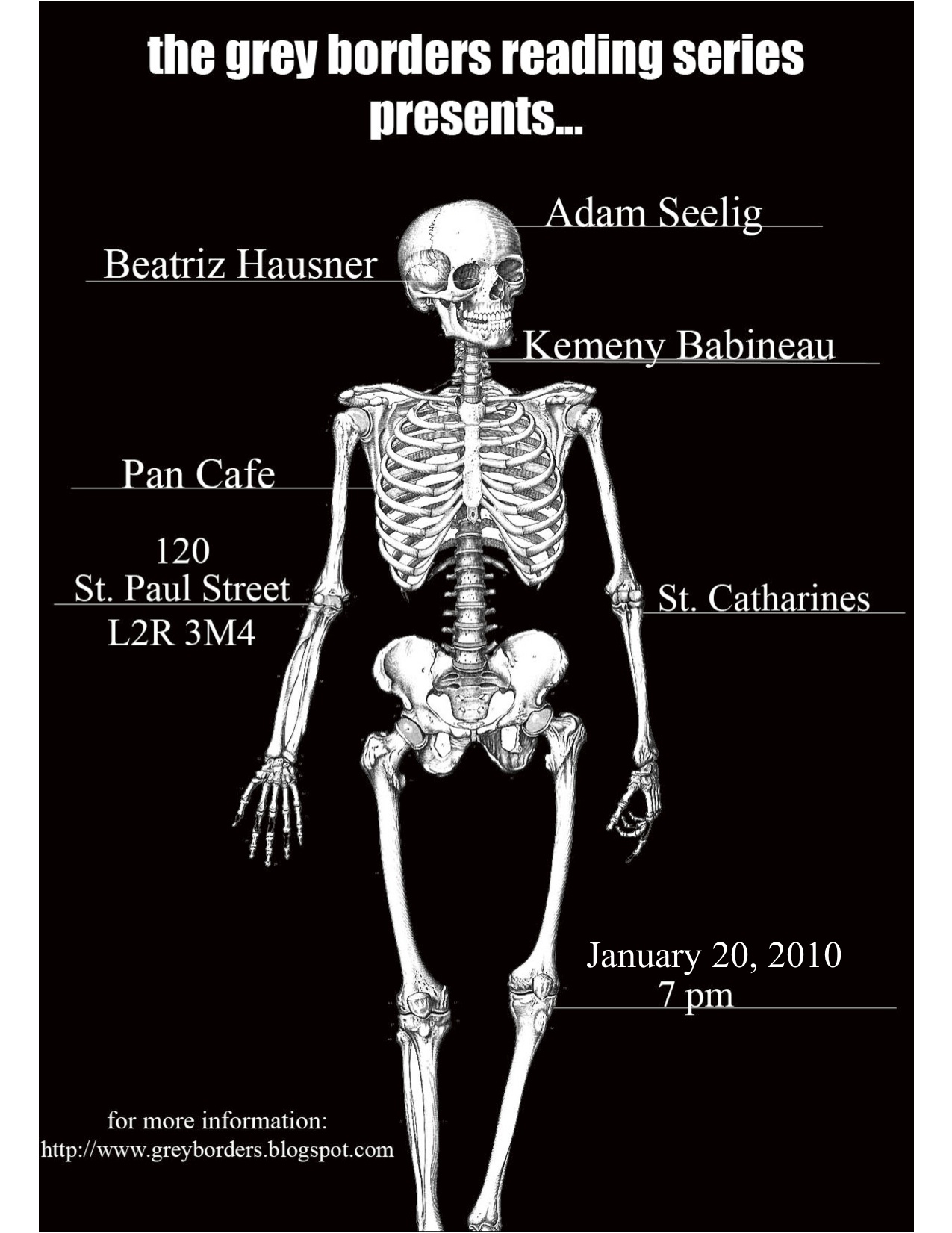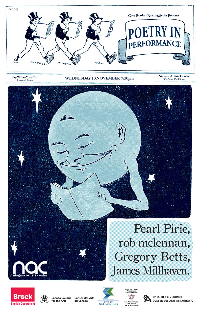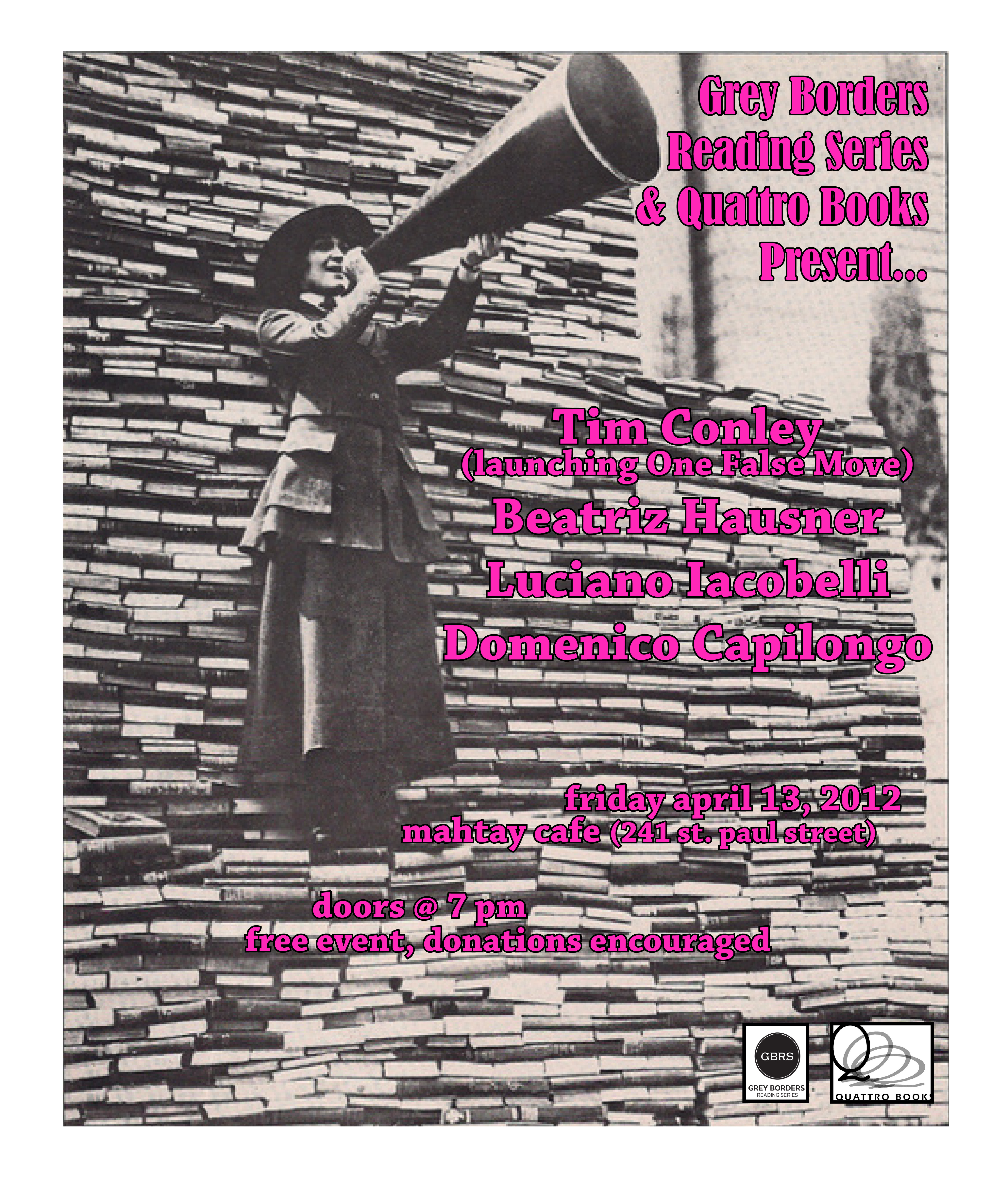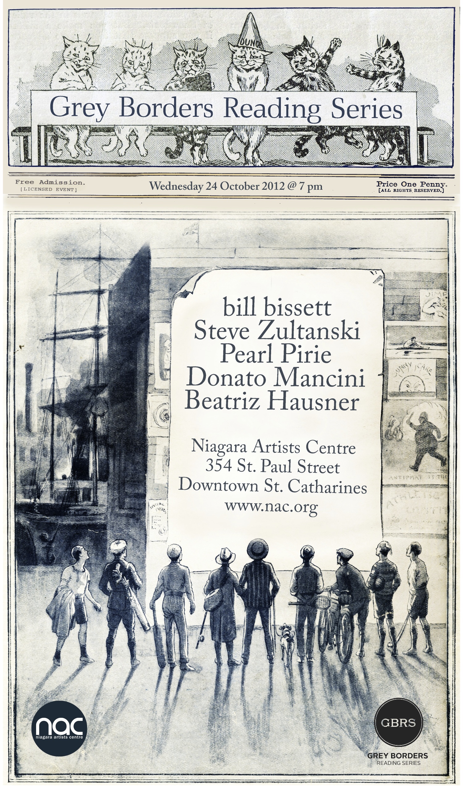 Below are promotional posters for the Grey Border Borders Readings Series, under the direction of Eric Schmaltz. Poster designers for the series included Natasha Pedros, Steve Remus, and Demi Peppas.